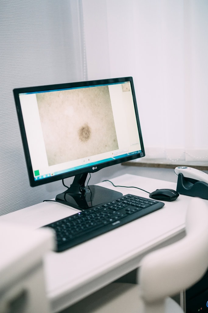 - Videogestützte auflichtmikroskopische Untersuchung: Eine erfahrene Hautärztin oder ein Hautarzt inspiziert die gesamte Hautoberfläche mit einem speziellen Dermatoskop. Dieses vergrößert und beleuchtet verdächtige Hautareale, um Pigmentveränderungen besser beurteilen zu können.